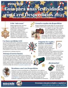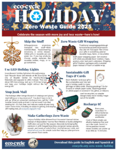 View or download the 2025 Zero Waste Holiday Guide! Eco-Cycle’s green holiday guide will help you enjoy a more meaningful, waste-free holiday season. For Boulder County residents: The Holiday Guide page 2 offers a quick guide to which holiday items are locally recyclable, where to recycle them, and special tree collection and recycling sites.