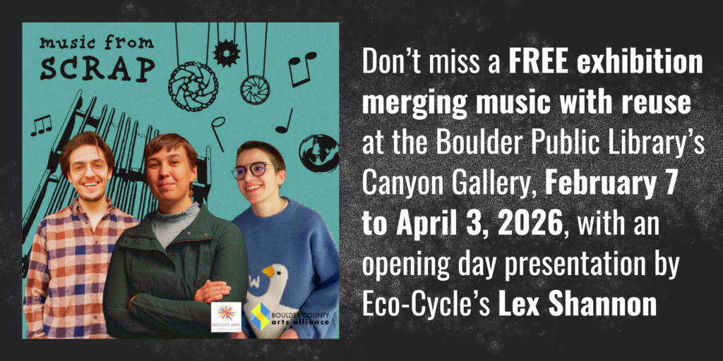 Eco-Cycle is proud to support Music from Scrap, an imaginative exhibition and performance series that uses the power of art and music to explore how reuse can reshape the way we think about natural resources. This ongoing exhibition by composer-performer-artists Abby Kellems, Gavin Kitchen, and Jessie Lausé will run at the Boulder Public Library’s Canyon Gallery from February 7 through April 3, 2026, and features playable musical instruments and graphic scores created from found, recycled, and repurposed materials, inviting visitors to explore reuse through hands-on music-making.